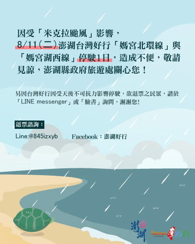 因受「⚡️米克拉颱風」⚡️影響,8/11(二)澎湖台灣好行「媽宮北環線」與「媽宮湖西線」停駛,造成不便,敬請見諒,澎湖縣政府旅遊處關心您!